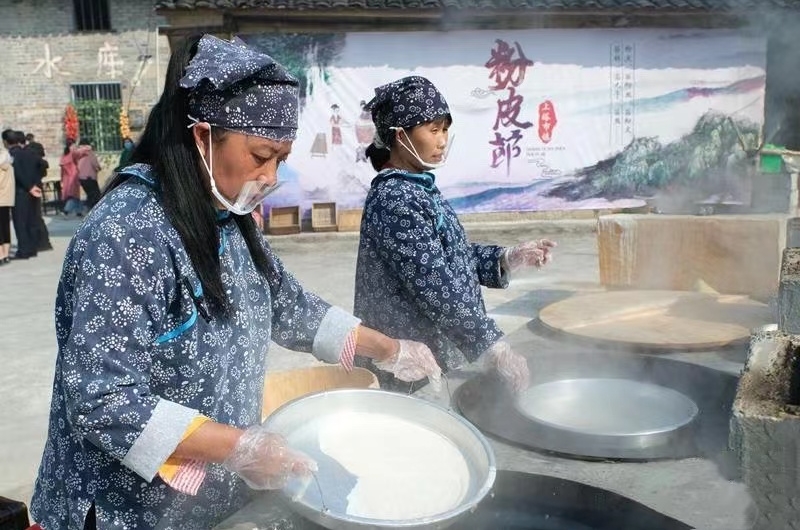 活动中,大家集体赶“市集”,现场看手工艺人制作粉条,近距离感受传统手工文化;集体围坐在一起品尝由粉条做成的各种美食,共享粉条宴,感受真正的乡村味道。同时,现场还设有粉条产品展销区、农产品直播区,大家纷纷买上当地的粉皮、粉丝、红薯粉、红薯片、辣椒酱、蜂蜜、茶叶等特色产品。还有许多党员在自己的朋友圈里为上塔市镇小坪村的特色农产品“打call”卖货。