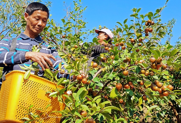 “粒粒黄金果,滴滴致富油”。11月1日,在岑川镇新福村爹爹岭油茶基地上一派繁忙景象,放眼望去,一株株油茶树青翠欲滴,金黄色的果实迎风摇曳,三五成群的村民正在赶时喜摘致富果,丰收的果实映红了收获者喜悦的脸庞。