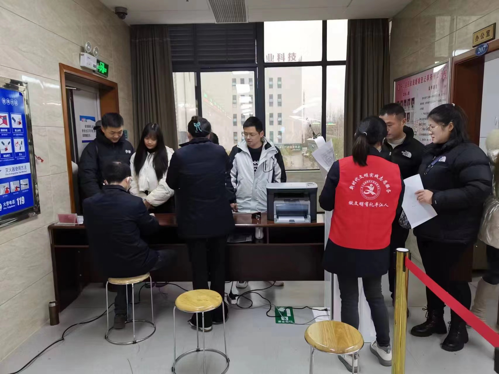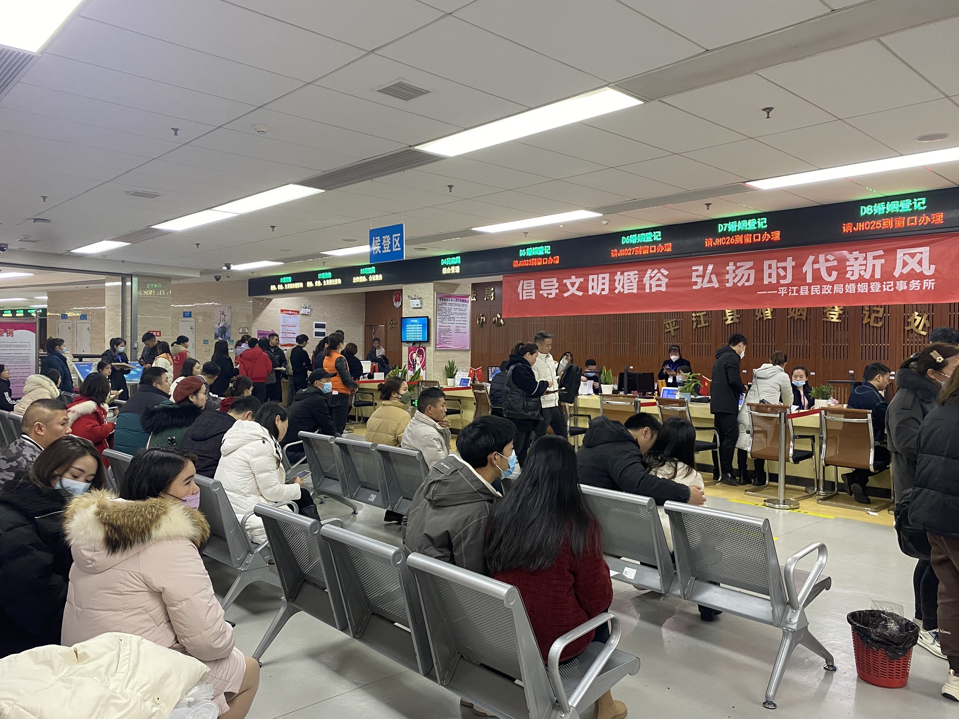 上午8时30分,前来“扯证”的准新人们在工作人员的指引下排成一小长队。在婚检处,各位医师有条不紊地为准新人们进行婚前检查,免费发放叶酸片。在候登区,工作人员为新人们现场答疑服务,宣传正确的婚姻观和家庭观,婚姻登记在温馨有序的环境中进行。