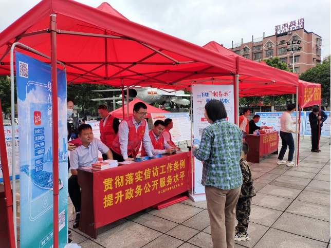值此《信访工作条例》实施一周年之际,5月24日上午,我县在彭德怀广场开展主题宣传暨第六个信访法制宣传月活动。为此,县行政审批服务局以此为契机,宣传推广“湘易办”,畅通信访投诉渠道,提升政务公开服务水平,让群众办事更方便,政民互动更畅通。