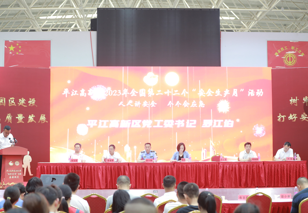 6月14日上午,由县总工会和平江高新区联合主办的2023年全国第22个“安全生产月”活动启动仪式在新金刚工人文体中心举行,县委常委、副县长仇文娟参加仪式,并宣布活动启动,平江高新区党工委书记罗江伯和县安委办主任、应急管理局局长彭小林参加启动仪式并讲话,县总工会分管负责人、平江高新区其他班子成员、部室负责人、园区企业分管安全生产负责人、参赛人员及亲友团共计180人参加活动,现场发放宣传资料2000余份。