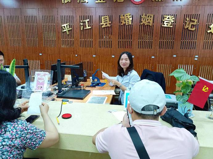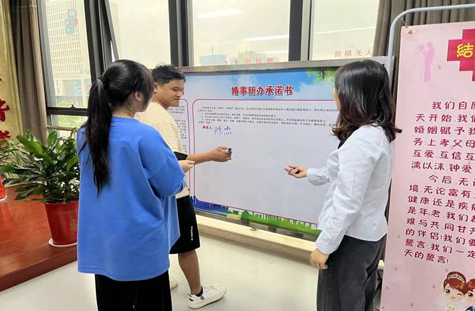 6月13日,婚登窗口刘桂英引导新婚夫妇在《婚事新办承诺书》上签名,宣传抵制高价彩礼,倡导文明婚俗。