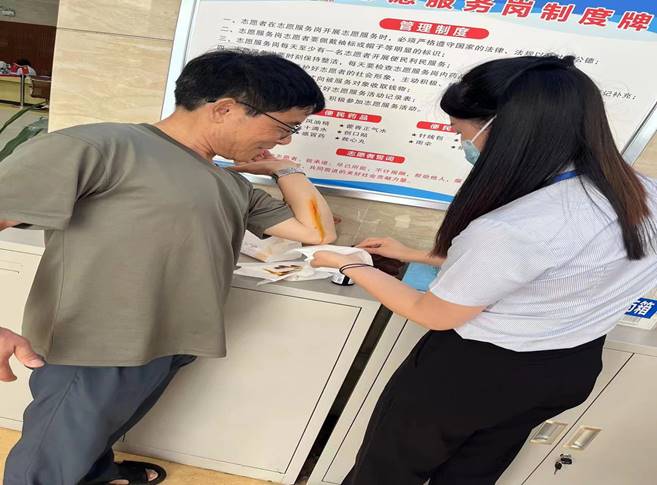 6月15日,政务中心前台导服张小芳为办事群众清理伤口,提供暖心服务。