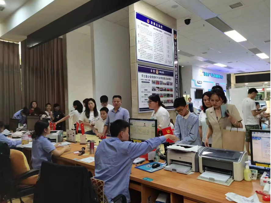 6月16日下午,公安窗口全体工作人员、邮政窗口、免费文印窗口为学生办理身份证提供延时服务。