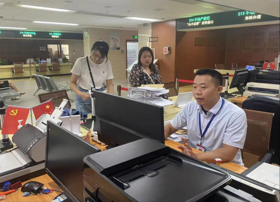 7月13日下午,不动产中心胡渊为办事群众提供延时服务。