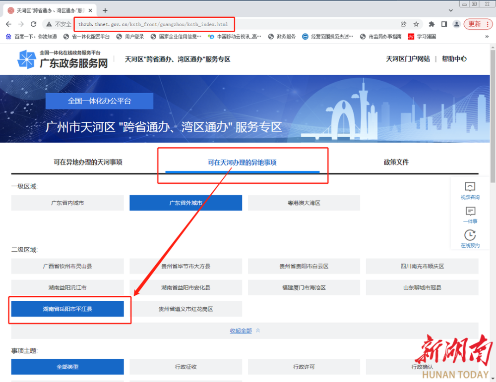 据了解,广州市天河区已在“跨省通办、湾区通办”服务专区网站设立平江县跨省通办专栏,上线了43个可网办事项,平江县在天河区工作的乡友可登录天河区政务服务网站,在“天河办理的异地事项专区”、广东省外城市中找到平江县事项办理区,异地申办原来要本人回平江才能办理的事项。如市监局的营业执照、人社部门的查询认证、教育局教师资格认定等业务。同样,在平江的群众也可以在该平台“可在异地办理的天河事项”专区申请办理在天河区需要办理的有关事项,切实享受到“数据多跑路,群众少跑腿”的政策福利。