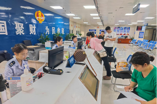 7月28日下午,税务窗口多名工作人员为办事群众提供延时服务。