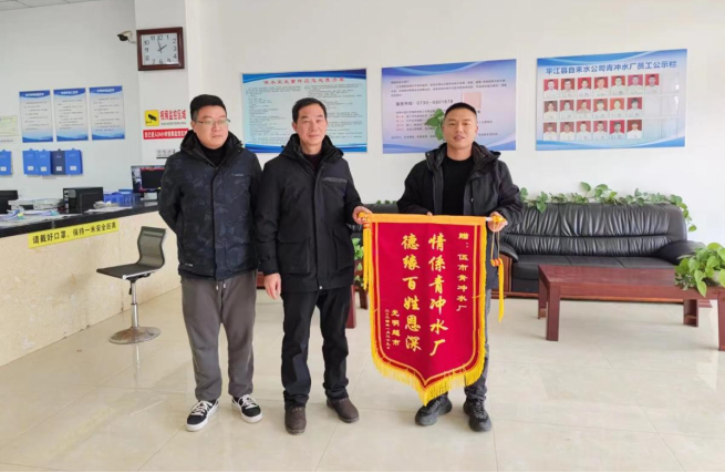 2月2日,县润恒自来水有限公司青冲水厂收到一面绣有“德缘百姓恩深 情係青冲水厂”的锦旗,“没想到自来水管道这么快就修好了,真的是感谢你们青冲水厂,为你们高效、优质、热情的服务点赞!”光明超市老板陈某某握着青冲水厂厂长李世的手激动地说道。