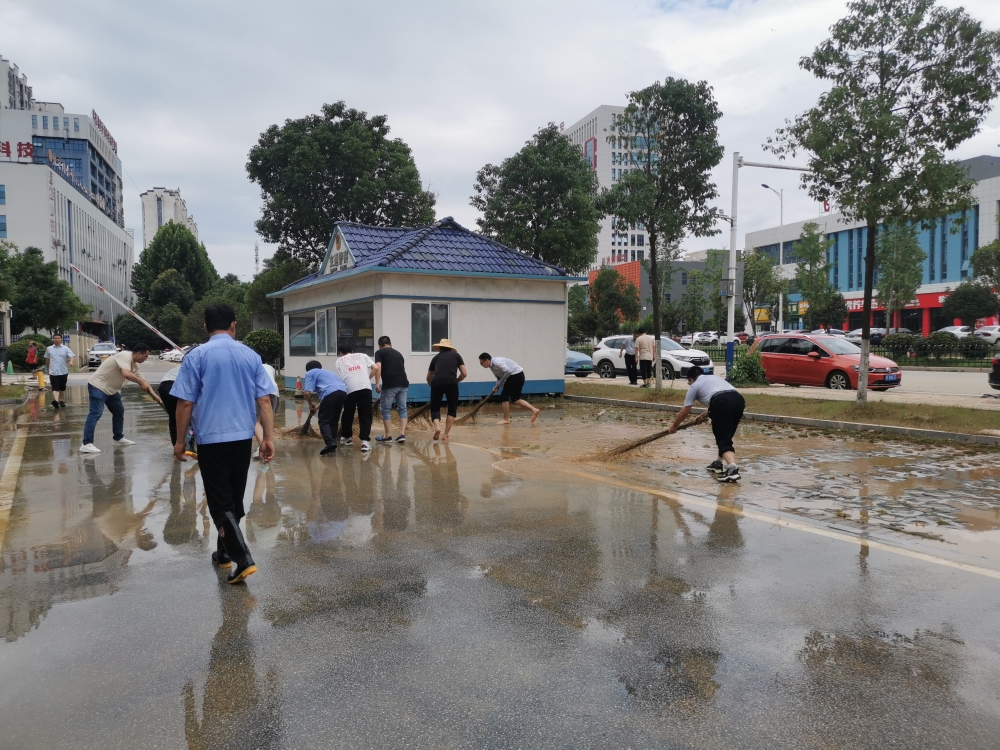 大厅各窗口志愿者集中力量清理停车坪淤泥,他们迎难而上、通力合作,尽自己最大的力量把家园清理干净美丽。