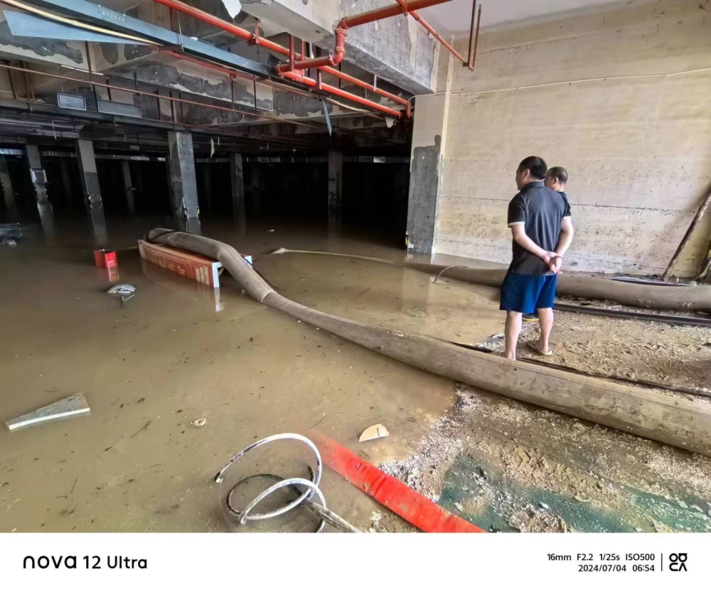 据了解,洪灾中,桂花学校被淹20多个小时,最高涉水高度近1.5米,整个校园地面和地下车库全部涉水,学校成为一片汪洋,受灾十分严重。洪水于7月2日下午退出校园,该公司的员工和设备在晚上十点到达学校,经过两个小时的装配和调试,两台崭新的抽水设备就开始抽水作业。为了加快进度,后来又增加一台抽水设备。同时,该公司还派出高压冲水车,对该校操场进行清淤。整个过程中,该公司相继派出26名员工,轮番作业,积极参与到学校各项重建工作中来,让学校尽快从灾害中恢复。该公司员工李炜峰家中房屋也在洪灾中倒塌,但他无暇顾及,只通过电话问询,一直坚守在支援学校的第一线。到7月3日晚,在该公司的大力支持下,经过48个小时的奋战,学校大部分地面全部清淤,并冲洗了一遍,地下车库抽水预计在7月3日11点左右完工。