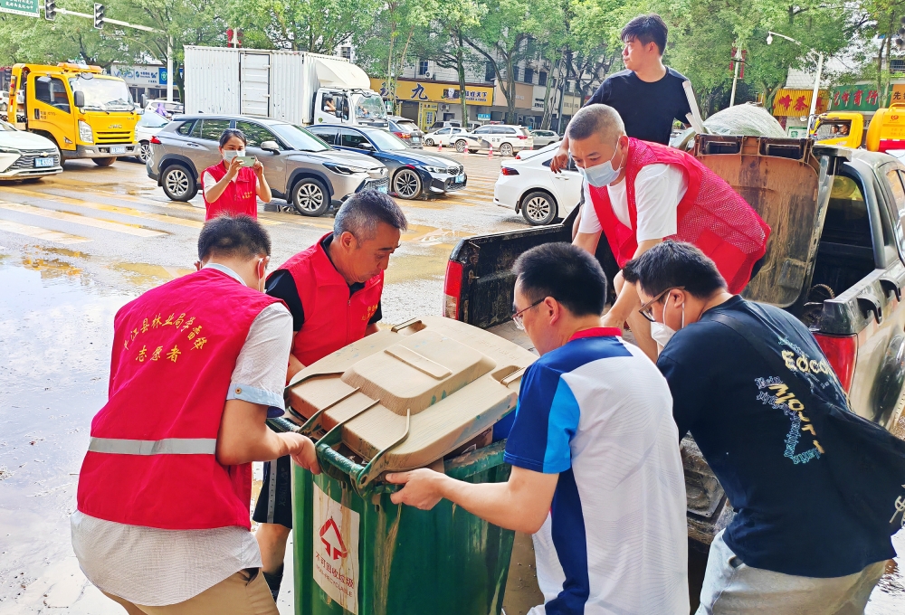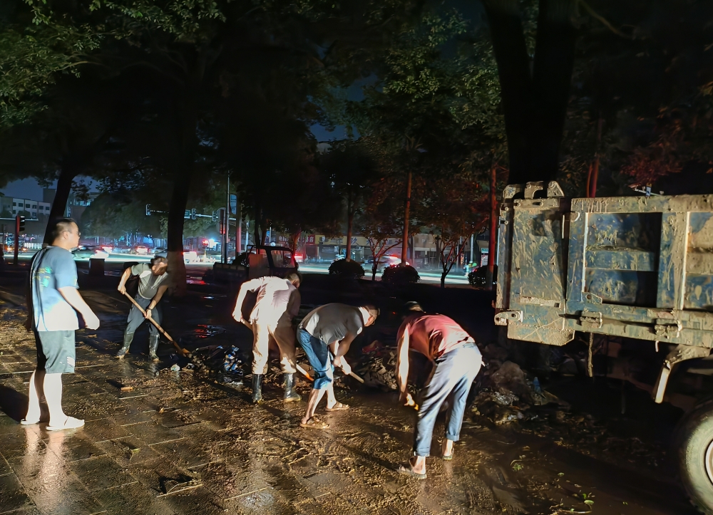 7月4日,在天岳大道路段,由县林业局58名干部职工组成的3支应急抢险队伍,正在紧锣密鼓地支援社区洪灾后清淤和垃圾清运。从7月1日洪魔来临之际,这支队伍就连续奋斗在抗洪一线现场和灾后自救现场。
