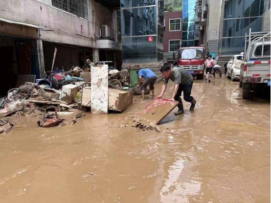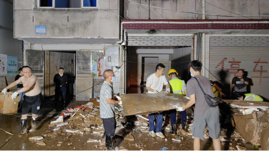 夜幕下,党员干部们手持铁锹、扫帚等清洁工具,不畏辛劳,奋力清除着积水退去后留下的厚重淤泥和散落垃圾。