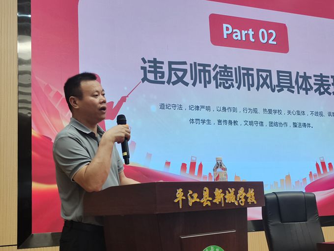 “师者为师、亦为范,学高为师、德高为范”“在新的历史形势下如何正本清源、重塑师魂”“要人敬的必先自敬,重师重在自重”……8月29日,新城学校在为期2天的暑期教师培训中,特邀请了县教育局纪工委主任李智就师德师风建设进行《师德师风警示教育》的专题讲座。