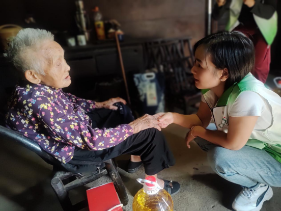 “刘娭毑,祝您重阳节快乐!”10月11日下午,县民政局西片社工站的6名驻站社工化身志愿者,前往浯口镇阪陂村开展为老志愿服务活动,为辖区内29名80岁以上的高龄老人送去重阳节的祝福,帮助老人整理房间、清洁卫生,并提供专业心理疏导、心理慰藉等服务。