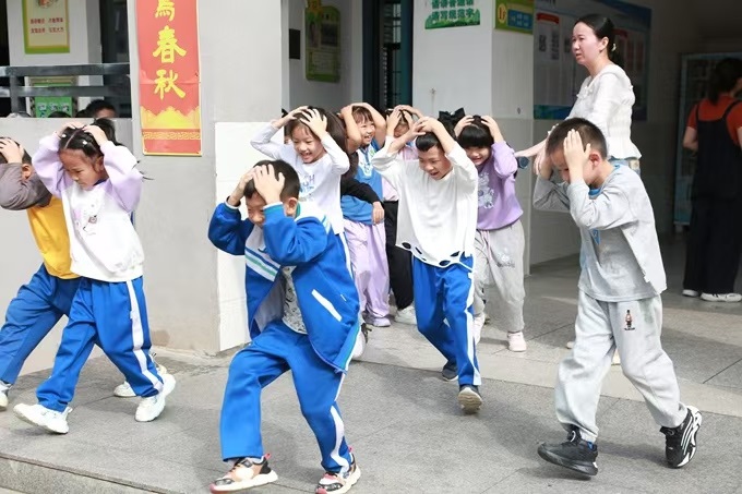 上午9点,“呜——”随着一阵阵急促、尖锐的第一次警报声拉响,防震演练正式开始。孩子们迅速反应,按照之前学习过的安全知识,双手抱头或用书本护住头部,迅速躲避到桌子底下、有柱子的墙边等安全位置。教室内秩序井然,大家屏息凝神,等待着“余震”的结束。