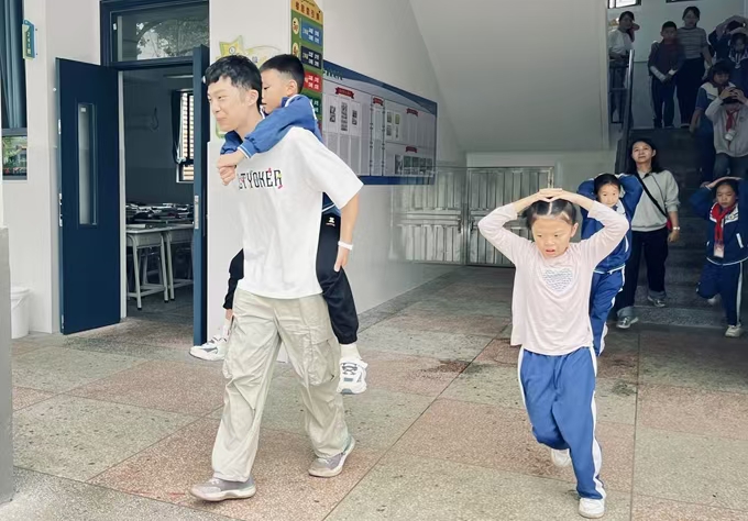 经过短暂的等待,指挥员拉响了第二次警报声,紧急疏散演练正式开始。在老师的带领下,孩子们迅速从教室里离开,用书本等物品紧紧护住头部,按照预先设定的疏散路线,有序快速地撤离。其中229班的张浩南同学因为脚扭伤,不能跑动,就由老师背着快速撤离到操场。经过短短2分50秒的时间,4400余名师生都已撤离到操场“安全区”。随即,各班主任清点人数,并向演练活动负责人汇报。
