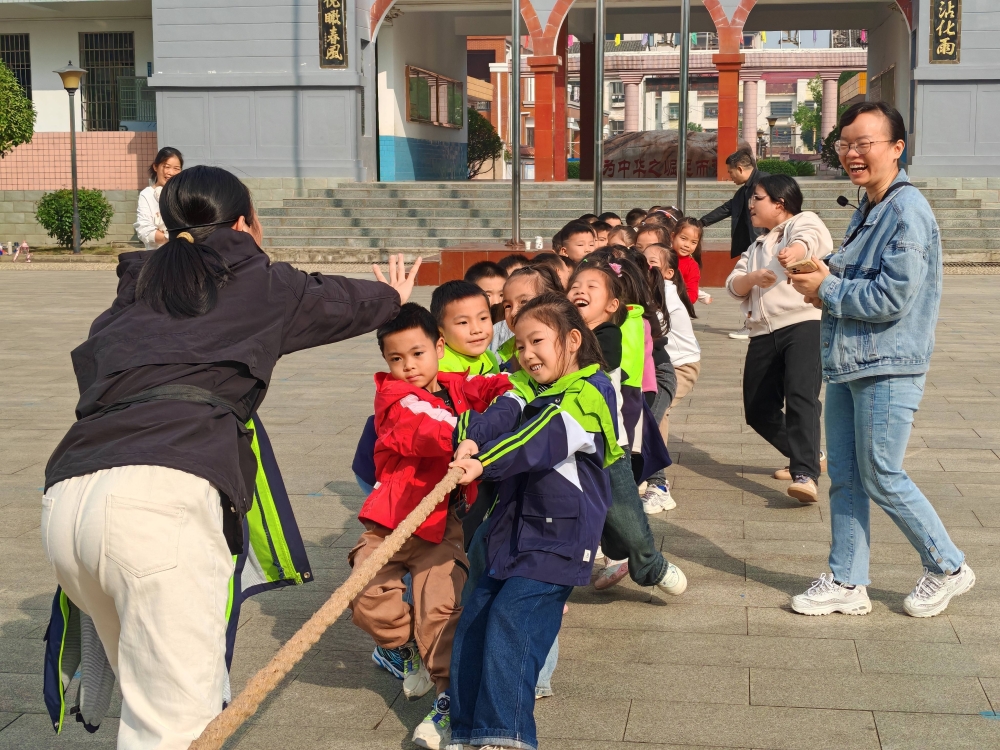 该校文化广场上,第一次参加运动会的一年级学生们摩拳擦掌,跃跃欲试。拔河比赛开始了,带队的老师双手握拳,喊着号子,引导孩子往后使劲。参赛的学生们双脚用力抓地,身体微微向后倾倒,拼命拉拽绳子,一寸一寸争夺阵地。大家团结一心,齐力争锋。赛事激烈,悬念迭生。“加油!加油……”两旁呐喊助威声此起彼伏,仿佛也参与到了比赛当中。
