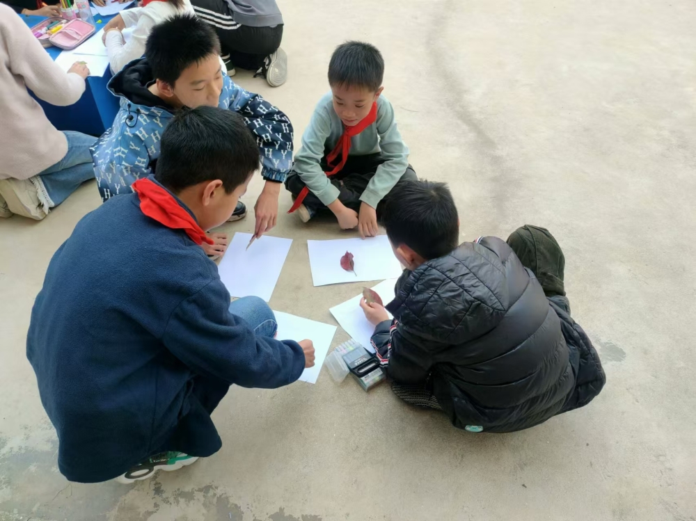 为了更好地上好这堂户外绘本课,高义小学的孩子们早早就准备好了水彩笔、A4纸、树叶等,井然有序地排好队在操场上满心期待着这节课的到来。很快,钟二喜就带着她温柔可亲的嗓音和大家打起了招呼。孩子们十分配合,仔细聆听钟二喜关于“树叶”的神奇故事。只看见钟二喜一会儿挥动着手臂,一会儿转起了圈,用那时高时低,充满磁性的声音为大家讲述着《落叶跳舞》这个绘本。随后,钟二喜布置起了一项特别的任务:用树叶创作属于自己的故事,可以是图片,可以是手工作品,还可以搭配自己创作的小诗。孩子们跃跃欲试,迫不及待地找好位置开始了自己的创作。瞧!一年级的刘磊正在小心翼翼地将钟二喜准备好的小眼睛粘贴在纸上。六年级的几位男生正聚在一起小声讨论着。四年级的刘文静盘地而坐,努力蹙眉思考着,一会看看树叶,一会盯着水彩笔,仿佛在筹谋着什么国家大事呢!不一会儿功夫,四年级的朱博韬就拿着作品到了钟二喜面前:是一幅“正在闹着玩的落叶图”呢!栩栩如生,活灵活现,充满了童真童趣,获得了钟二喜的好评和小礼品。之后,各年级陆陆续续提交了自己的作品,均获得了钟二喜的高度评价和不同的小礼物,孩子们可开心了。三年级的龚梓玥创作的《树叶手拉手跳舞》获得了所有老师的一致认可,一举拿到了钟二喜奖励的唯一的诗歌创作本。钟二喜鼓励大家:“每个人都是有潜力的,你们非常棒。你们一定要多读书,和书做一辈子的朋友。”