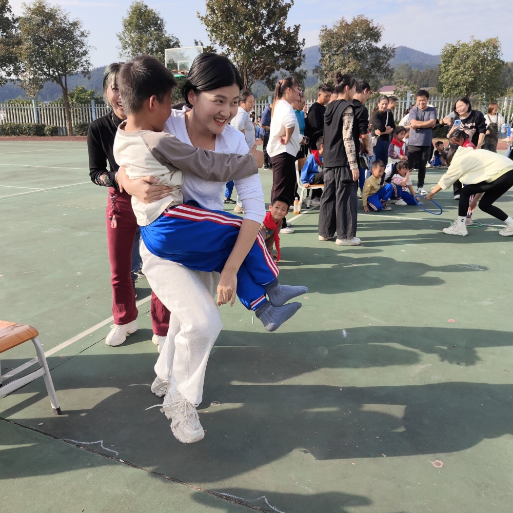 值得一提的是,本次运动会还特别设置了亲子互动环节,旨在促进家长与孩子之间的情感交流。热身赛“呼啦圈过山车”让家长和孩子们迅速融入欢乐的氛围中;低年级家庭参加了“过河搭桥”游戏,中年级家庭尝试了“背对背运球”,高年级家庭则挑战了“两人三足”。通过这些有趣的活动,不仅加深了家长对孩子成长环境的了解,也让孩子们感受到了家庭的支持与爱。