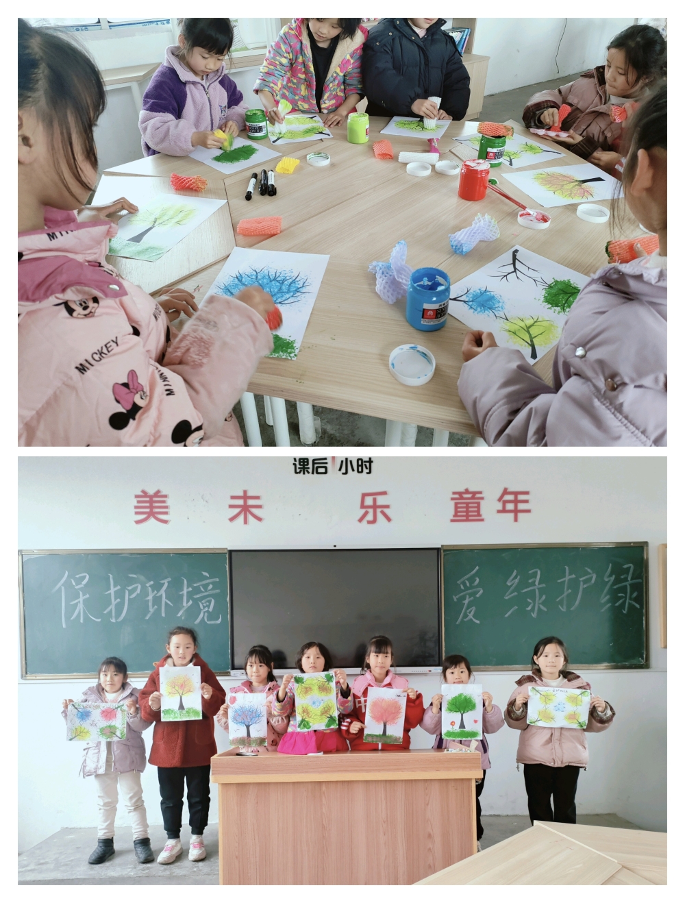 活动伊始,全体师生在多媒体教室观看了环保主题电影。观影结束后,同学们来到手工教室,参与“水果网创意绘画”活动。他们用灵巧的双手,将废弃的水果网变成了一棵棵大树、一朵朵鲜花、一只只小鸟……