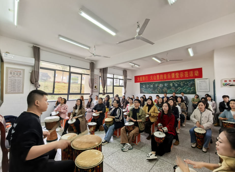 培训在简短而热烈的开班仪式中拉开序幕。随后,一堂生动精彩的现场观摩课《手鼓表演与教学交流》立刻点燃了全场氛围。龙门镇中心小学音乐老师袁威给龙门镇中心小学的604名孩子和20位老师,现场教授了激昂的《丽江三部曲》和恢宏的《大中国》等曲目,展现了手鼓独特的艺术魅力,也让参训教师们直观感受到了打击乐在教学中的巨大潜力。