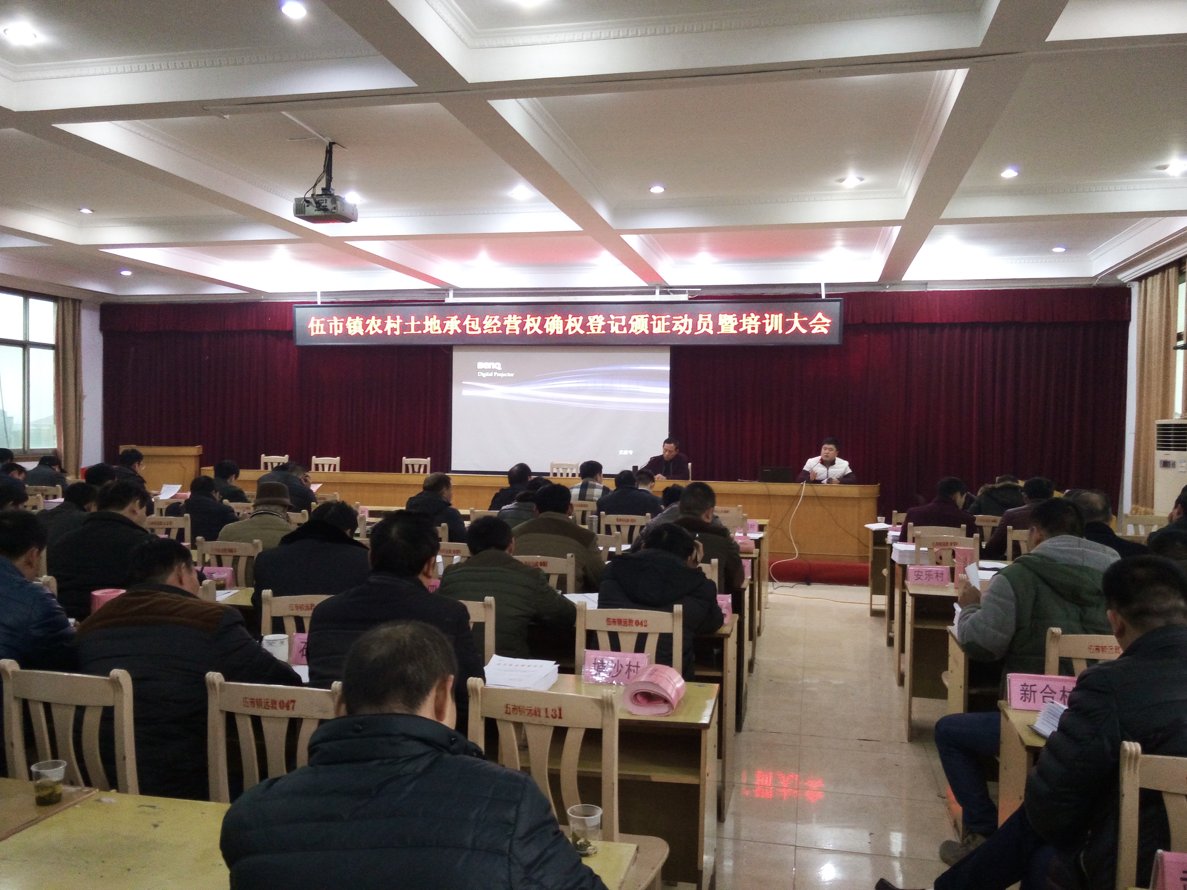 1月14日,伍市镇召开农村土地承包经营权确权颁证动员大会,镇全体机关干部、各村村支书、村主任共计165人参加会议。镇人大副主席潘九三主持会议。