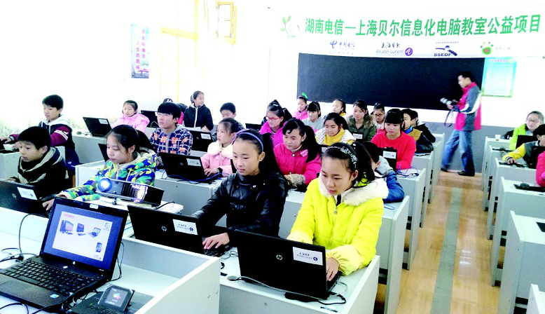 12月15日,湖南电信—上海贝尔信息化电脑教室公益项目捐赠仪式在平江县瓮江镇双江中学举行。上海贝尔公司向双江中学捐赠30台再生电脑,用于中学多媒体教学。上海贝尔公司和湖南电信岳阳分公司负责人表示,将进一步加强与地方特别是贫困山区的合作,继续加大扶贫扶智力度,为实现全面建成小康社会、推进精准扶贫、加快岳阳建成“一极三宜”江湖名城作出更大贡献。图为双江中学学生在多媒体教室学习使用电脑。 记者 李 冀 摄