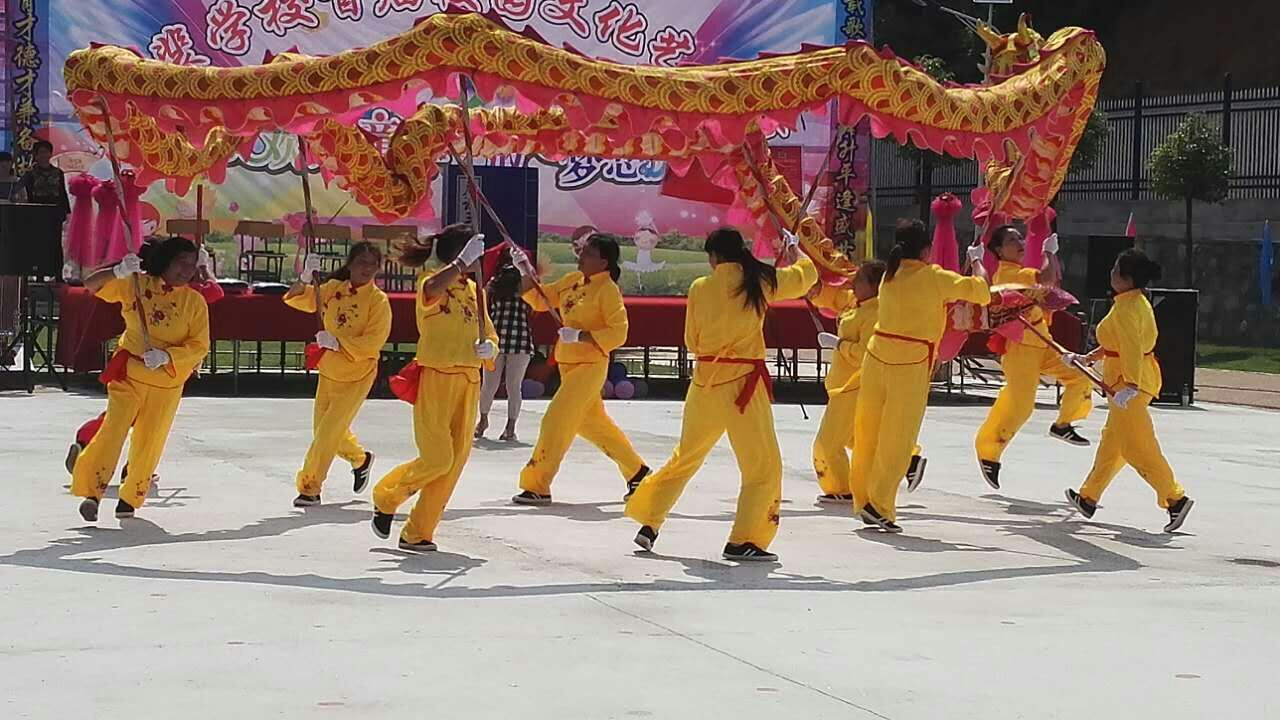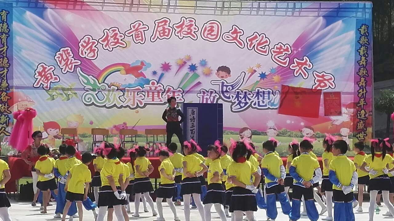 原来,当天黄裴学校首届校园文化艺术节精彩开幕。镇长张创国热情洋溢的讲话后,歌舞、合唱、小品、国学诵读等14个精心准备的节目,有序拉出,不俗的表演,让人叹为惊止。师生、家长、寓外乡友等数百人,围观点赞。该地女子黄龙队,热情舞龙助兴,为艺术节增添了浓厚的色彩。