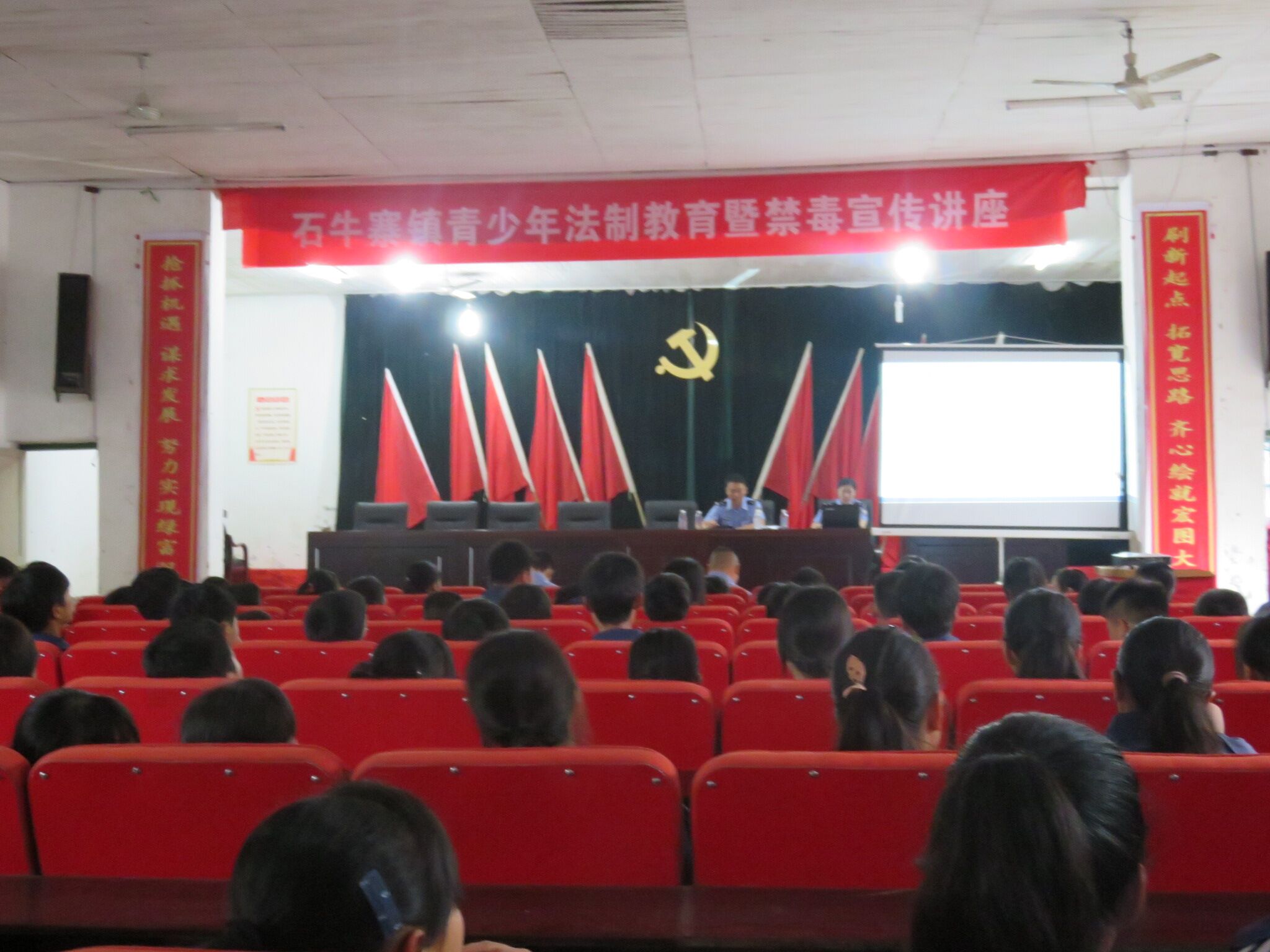 为增强在校青少年的法律意识,6月27日上午,石牛寨镇组织大坪中学、浆市中学200余名学生在镇礼堂开展了一次法制教育暨禁毒宣传讲座。镇党委委员吴泽,派出所所长李江平参加了讲座。
