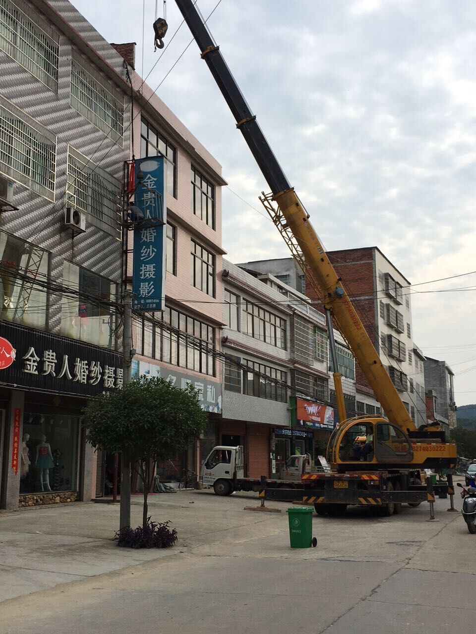 6月22日,浯口镇官坡路的一家店前,10多名工作人员开始对违规设置的户外立式广告牌实施清拆,现场设置了警戒线,一辆长臂吊车停在路边,清拆工人对违规招牌进行拆除,拆下的广告牌被放入货车里。