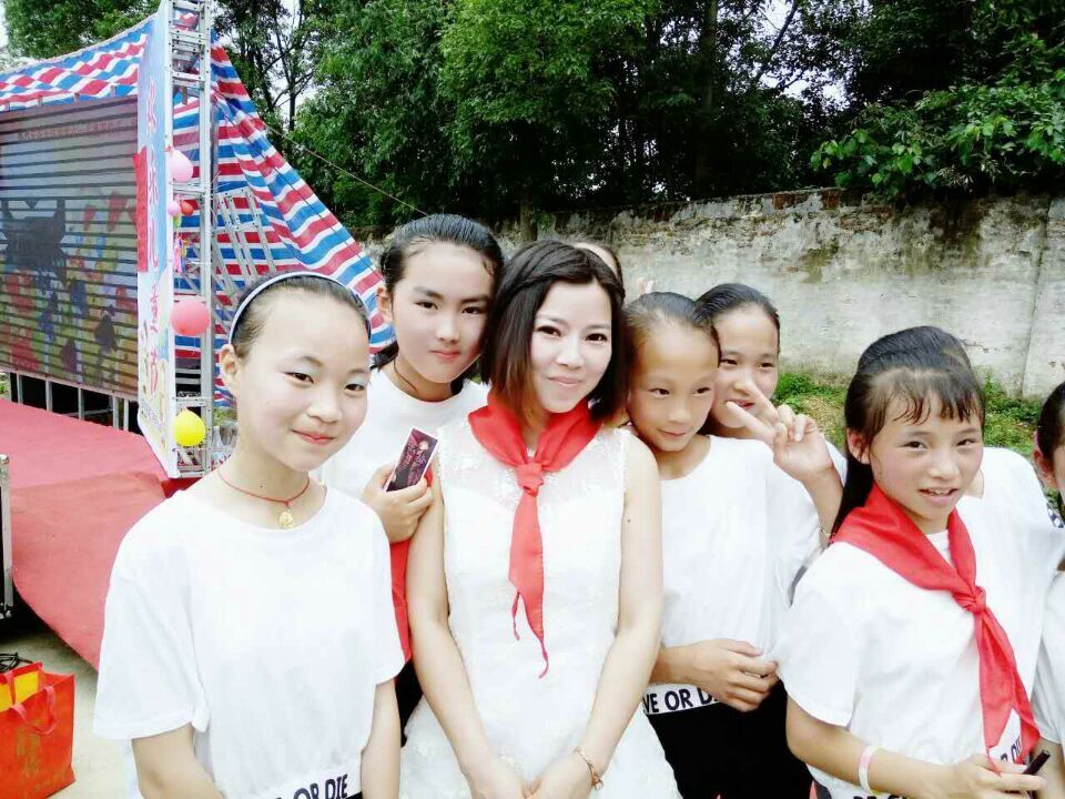 当我们走进校园时,发现学校里的师生正围坐在操场上等候叶丹。学校校长姚军辉介绍,时丰小学是一所三村联办的完小,只有226位学生,10位老师,学校教学任务比较重,但老师们都很敬业。学校近两年来了3个90后的年轻老师,为学校带来了活力。见歌星叶丹要来陪家乡孩子过六一,全体师生都很高兴,加班加点排练节目。“叶丹算得上是学校成立以来到这里的第一位上过央视大舞台的大明星,大家都很兴奋!”