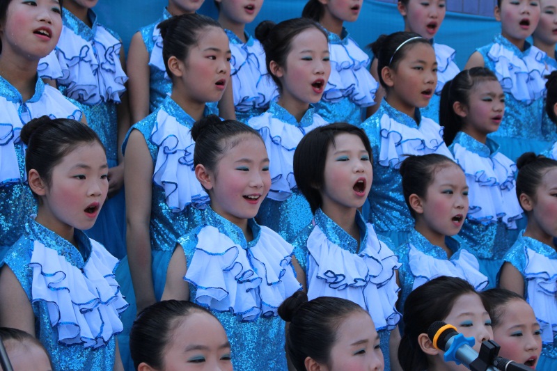 师生节目完后,叶丹走上台,祝福家乡的孩子节日快乐,好好学习,健康成长。接着为全校师生唱了《孤独的橘子妹》、《我相信》、《世上只有妈妈好》三首歌……叶丹青发现自己演唱过的不少歌曲,学生们都能哼唱几句,于是他站在操场中央,带着大家一起大合唱。没想到平日唱歌有点慢半拍的山里学生,用手打起“节拍”还特别娴熟,可能是叶丹领得很认真的原因吧,孩子们都跟着叶丹姐姐摆起手来,气氛很热闹。场景很温馨。学生很高兴。