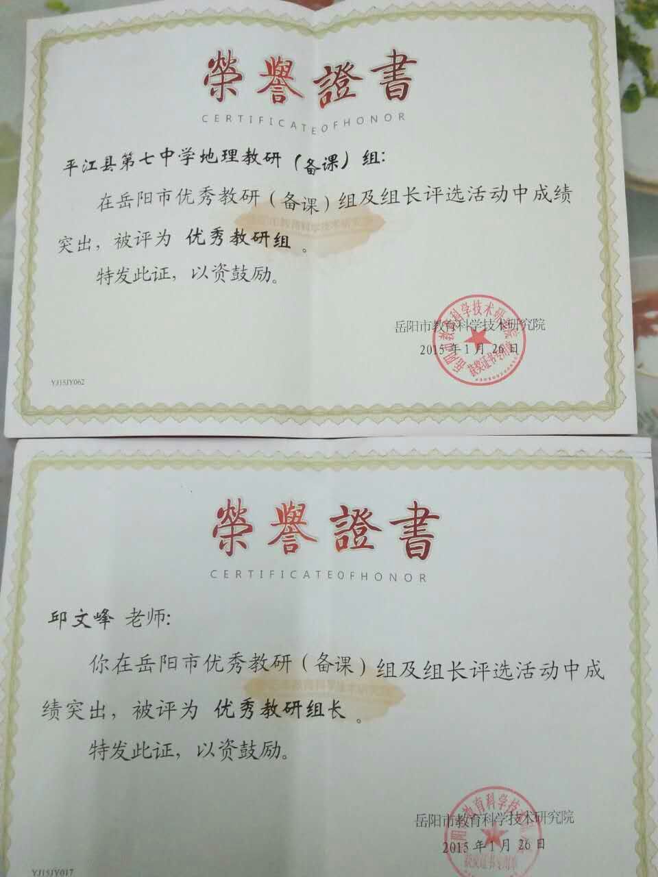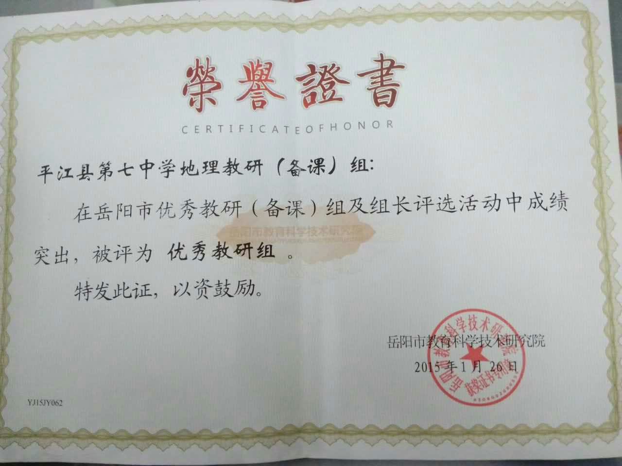 与此同时,该组有多名教师获得过优秀教师、先进个人、优秀班主任等荣誉称号,多名教师的优质课、论文、课件、教学设计、教学反思等教学科研成果获奖。平江七中高中学业水平考试中学生的地理成绩在同级同类学校中名列前茅,多次受到市教育局表彰,并于2015年获“市级优秀教研组”殊荣。