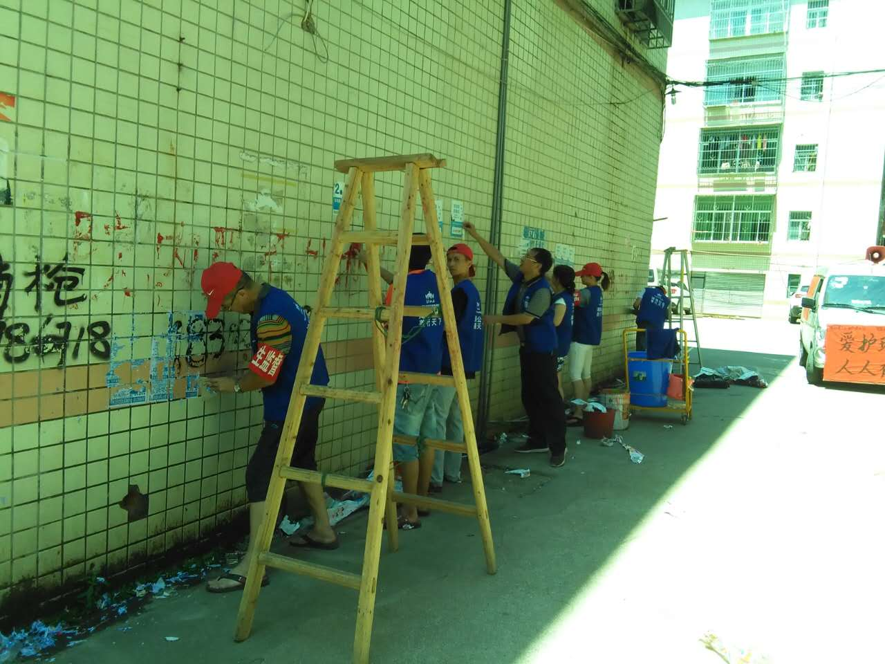 7月22日,平江三区计划社工站志愿者联合东北街社区党支部党员志愿者,在7.18洪灾生产自救系列活动中,从整治环境、共建家园入手,在城区配合长寿镇镇党委政府号召和行动,全面清理街道牛皮癣。