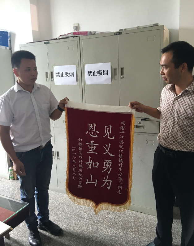 事情发生后,获救小孩的父母出于感激之情四处打听孩子的救命恩人,几经周转才了解到魏平是瓮江镇政府干部。近日,孩子的家长魏先生送来了一面锦旗,并向魏平同志的主管领导和瓮江镇政府表示感谢并致以崇高的敬意,魏先生说:“感谢魏平及时救起我家孩子,要不然,孩子就没命了,魏平是我们一家人的救命恩人!”。“在大力弘扬道德文化建设的今天,发扬大爱的精神,是我们不懈的责任。魏平同志见义勇为的行为,值得我们所有人称赞和学习!”魏平的主管领导向在场的人提出倡议。