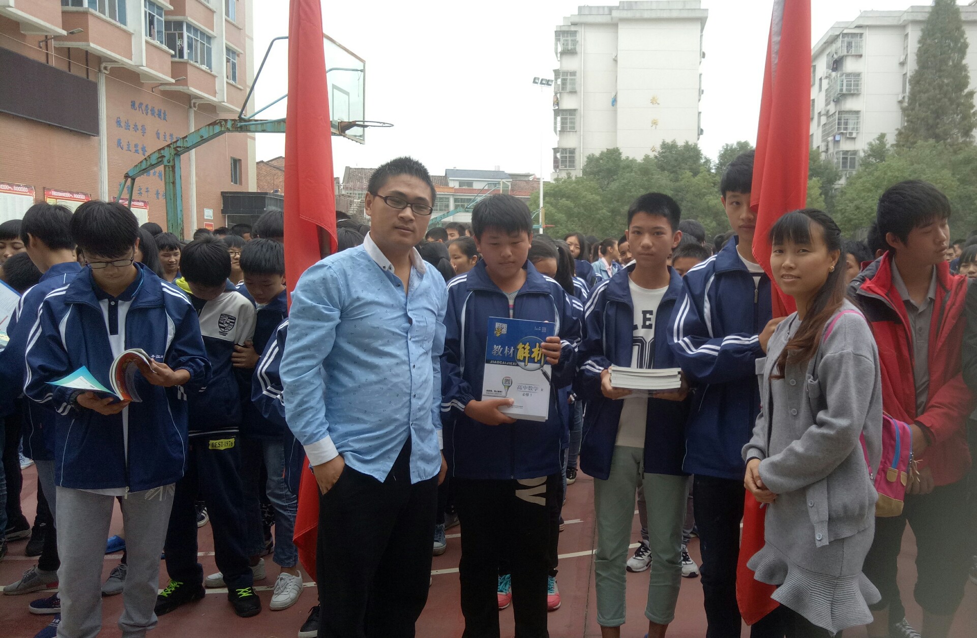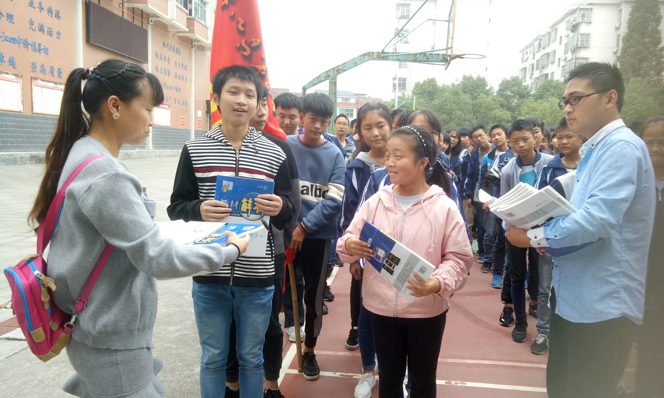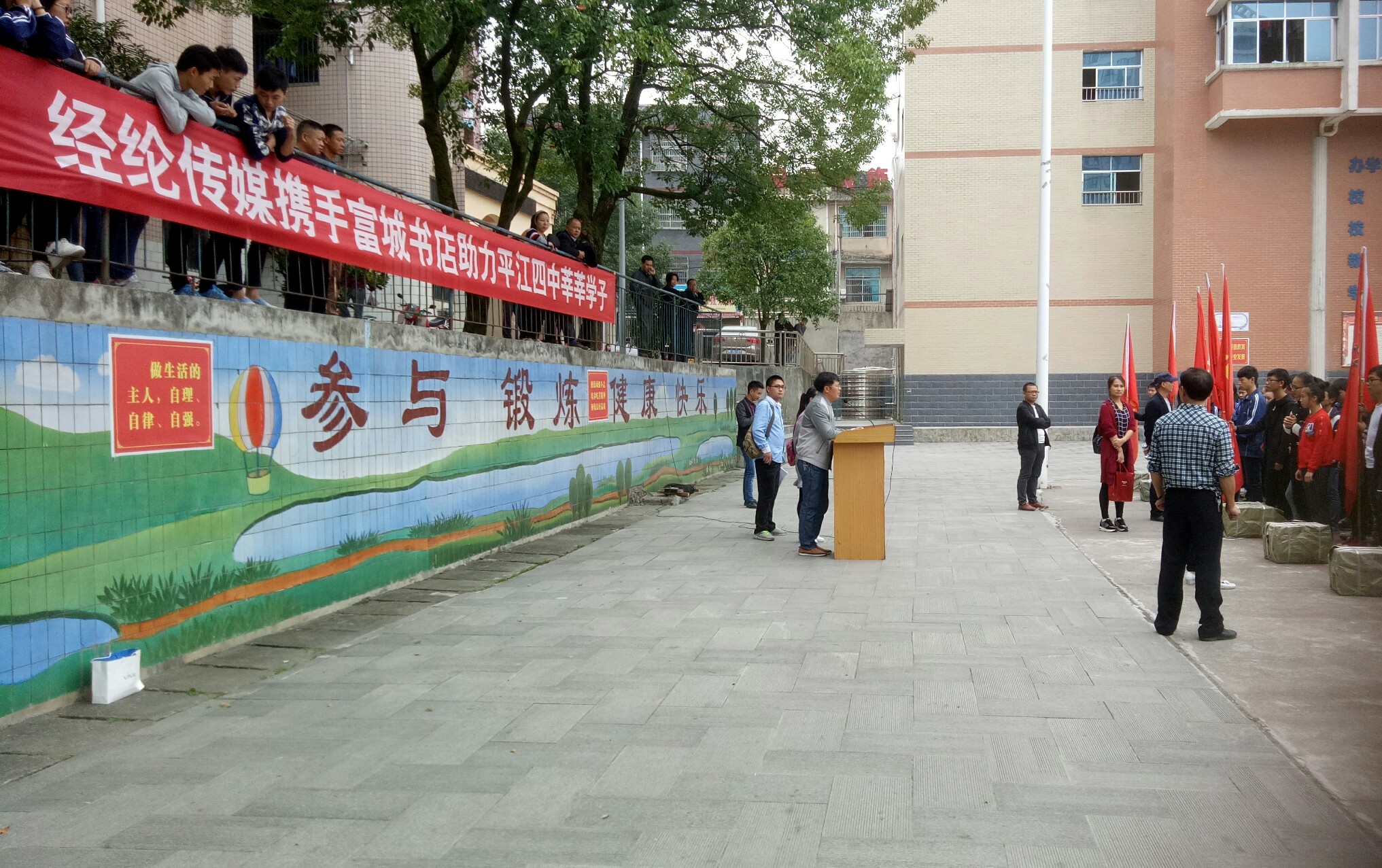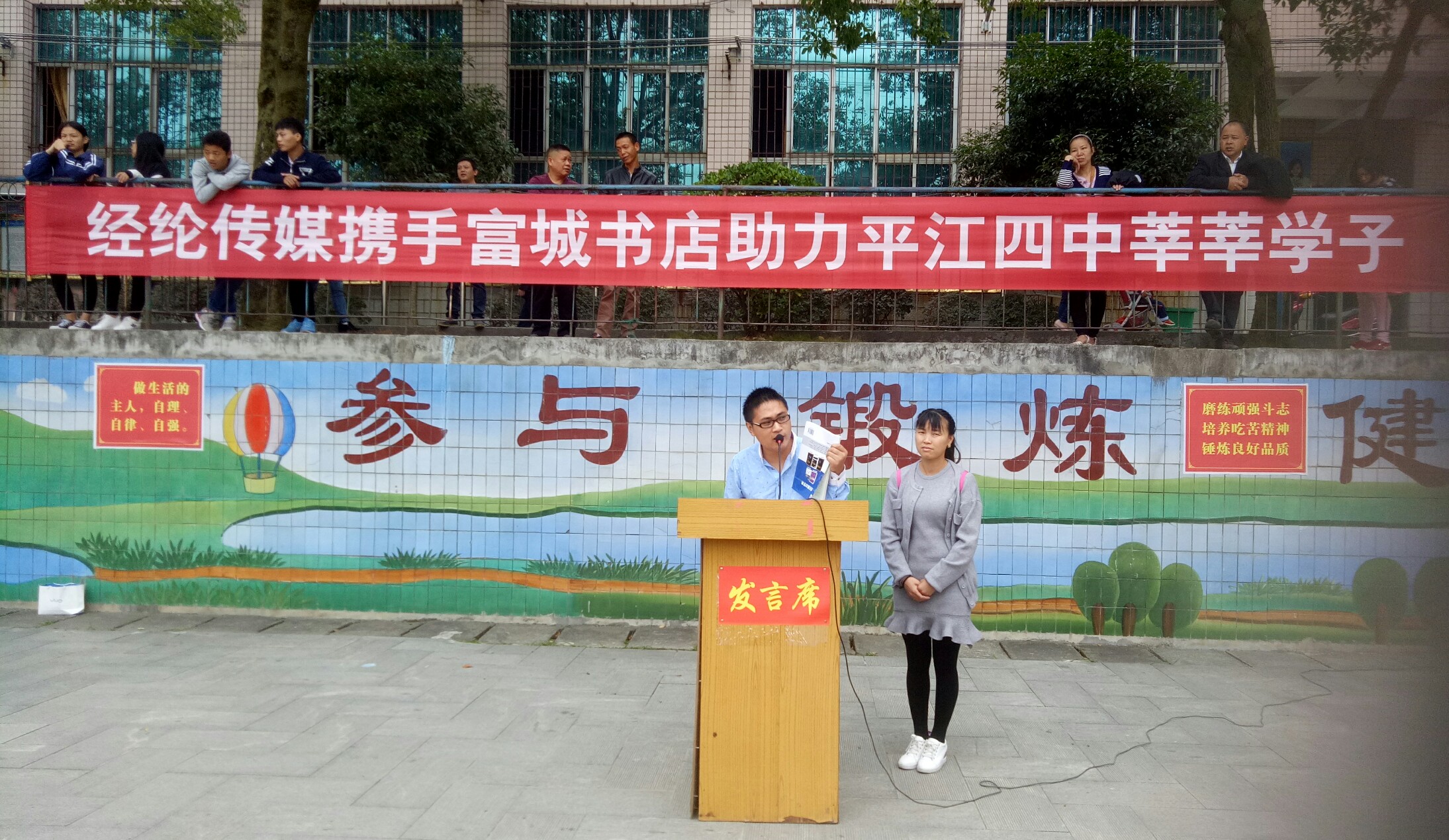10月15日上午,平江四中高一年级800多名师生整齐列队在篮球场前,欣然接受南江富城书店老板喻欢欢捐赠的近千册各科《教材解析》和教学指导用书。校园内秋风飒爽,丹桂飘香,会场中央“经纶传媒携手富城书店助力平江四中莘莘学子”的大红标语分外惹人注目。