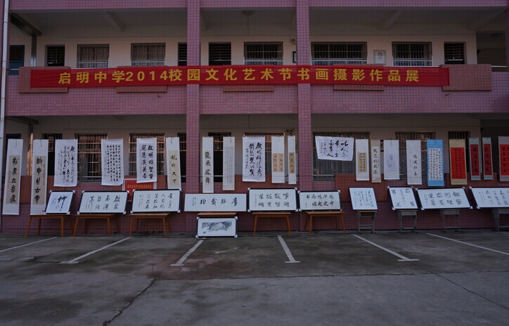书画摄影作品展有师生为艺术节比赛而创作的作品、有师生在省市获奖的作品、有“传统文化进校园”名家来校交流教学的作品。展览在综合楼前展出,作品书体多、画种丰富,吸引不少人驻足停留,有的家长、老师不时用手机将作品拍下来。