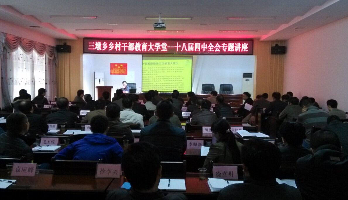 11月12日,三墩乡乡村干部教育大学堂开课。此次以学习十八届四中全会精神为主题,邀请市委党校霍益辉教授进行专题解读。全乡机关干部、各村支部书记、副书记、村主任和部门负责同志共100余人认真聆听了讲座。