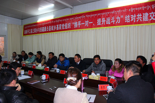 活动期间还召开了两乡基层党组织“携手一对一,提升战斗力”交流座谈会,三阳乡班子成员、绒乡代表团成员共20余人进行了亲切交流。山南地委组织部副部长余前广、岳阳市委基层办主任蔡吉伟、平江县政府副县长欧阳晓耀等领导出席座谈。会上,三阳乡党委书记潘典宏致欢迎词,并简要介绍了该乡在基层党建工作和基层党风廉政建设、干部管理、乡村干部服务全县重点工程工程建设等方面的经验作法;桑日县绒乡党委副书记、乡长符伟介绍了绒乡支村两委换届以来的工作情况,三阳乡对口援助的达嘎村支部书记索朗平措用藏语表达了自己的感激之情。