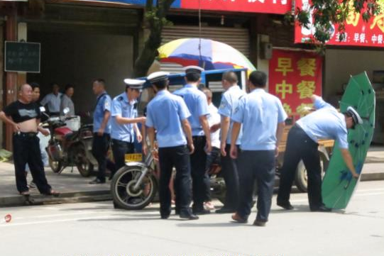 民警在拆除非法安装的摩托车晴雨伞
