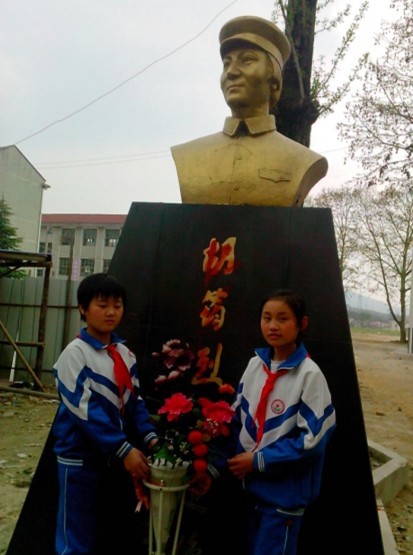 平江县虹桥胡筠学校,胡筠烈士雕像庄严肃穆地矗立在操场东北角。清明前夕,该校学生穿着整齐的校服,佩戴红领巾,手握鲜花,列队于胡筠烈士雕塑前,向烈士默哀,敬献鲜花。