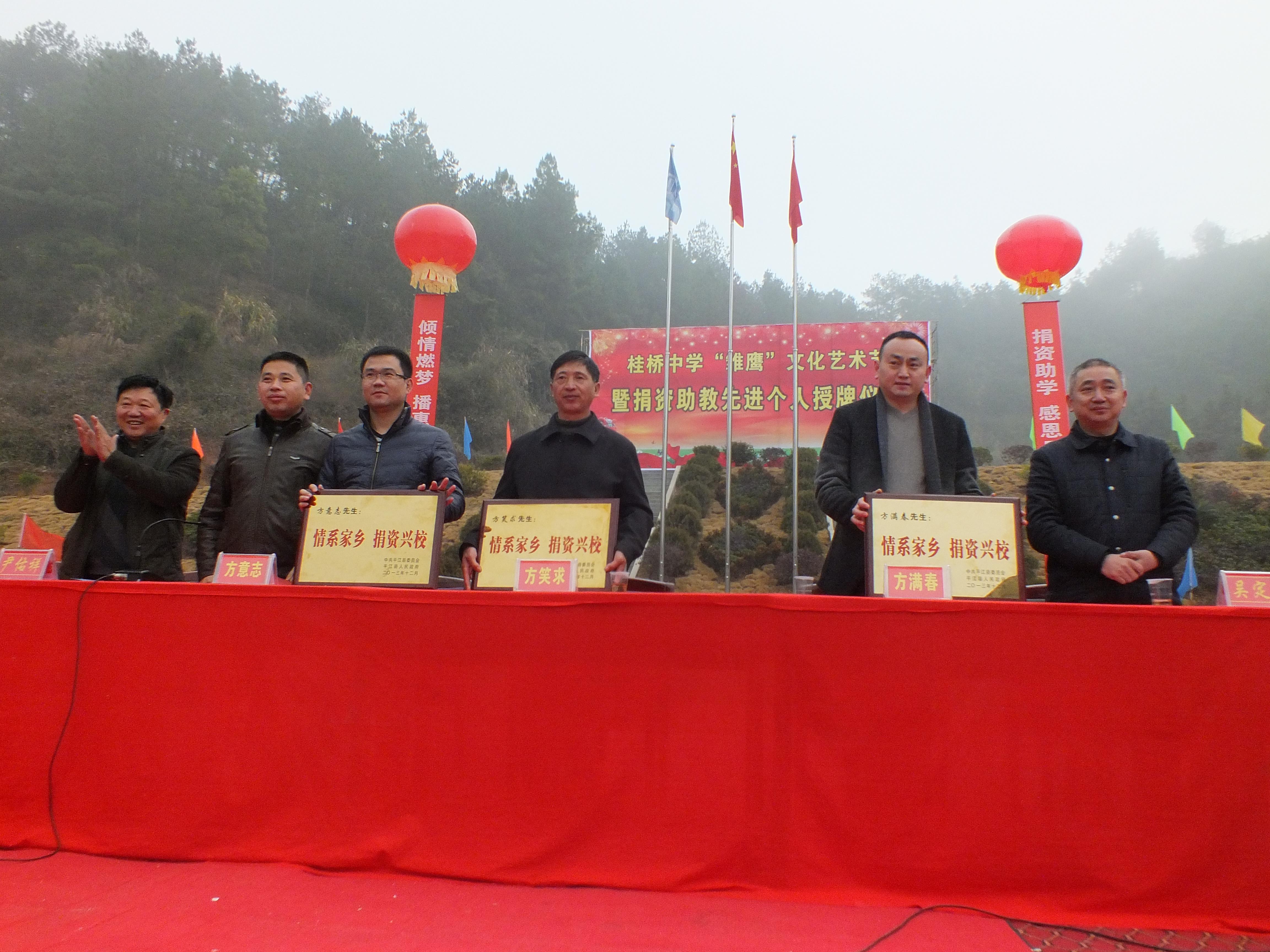 12月20日,长寿镇桂桥中学举行了“雏鹰”文化艺术节文艺汇演暨捐资助学表彰仪式。“雏鹰”文化艺术广场由湖南省方正科技有限公司董事长方笑求先生,东莞市宇熙精密连接器有限公司董事长方意志先生,武汉市诚博发有限公司董事长方满春先生共同捐资30万建造而成。在热烈欢快的文艺汇演中,桂桥中学师生表达了对捐资助学的三位校友的感激之情,三位乡友的善举也获得了周边群众的一致好评。县教育局局长吴定辉、长寿镇党委书记尹佑祥为三位乡友颁授奖牌。