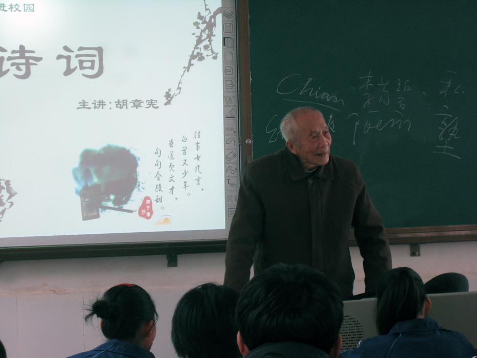 “今天我讲的诗词有‘笑话诗’、‘打油诗’、‘七绝诗’,诗词的起步写作要讲究通俗,讲究音律美”。“我给大家朗诵一首新近创作的《重访官塘》——‘八十阿翁喜再游,人间淘尽旧时愁。花开遍地摇钱树,好个官塘富出油’。是不是很通俗,还有音律美?”诗词讲座教室内,已有八十八岁高龄的中国诗词协会会员、平江县天岳诗社胡章宪老人给师生们上诗词课,教室内不时传出轻松的笑声,爆发出阵阵热烈的掌声。