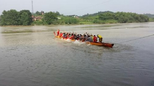 正说着,江面上锣鼓声声,由远及近,只见一艘龙舟劈波斩浪,飞驰而来。随着鼓点节奏,划手们手中的木浆整齐起齐落,奋力前划,声势响震江河两岸,吸引了不少两岸居民前来赏光。这次参赛的二十六名队员年纪大多为二、三十岁,身强力壮,说起这次比赛他们信心十足。