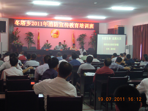 本网讯 7月19日,冬塔乡举办2011年首期消防宣传教育培训班,乡村两级干部、各宾馆、酒店、网吧、加油站、超市等负责人、烟花鞭炮批发零售商以及群众共80多人参加了本次培训。