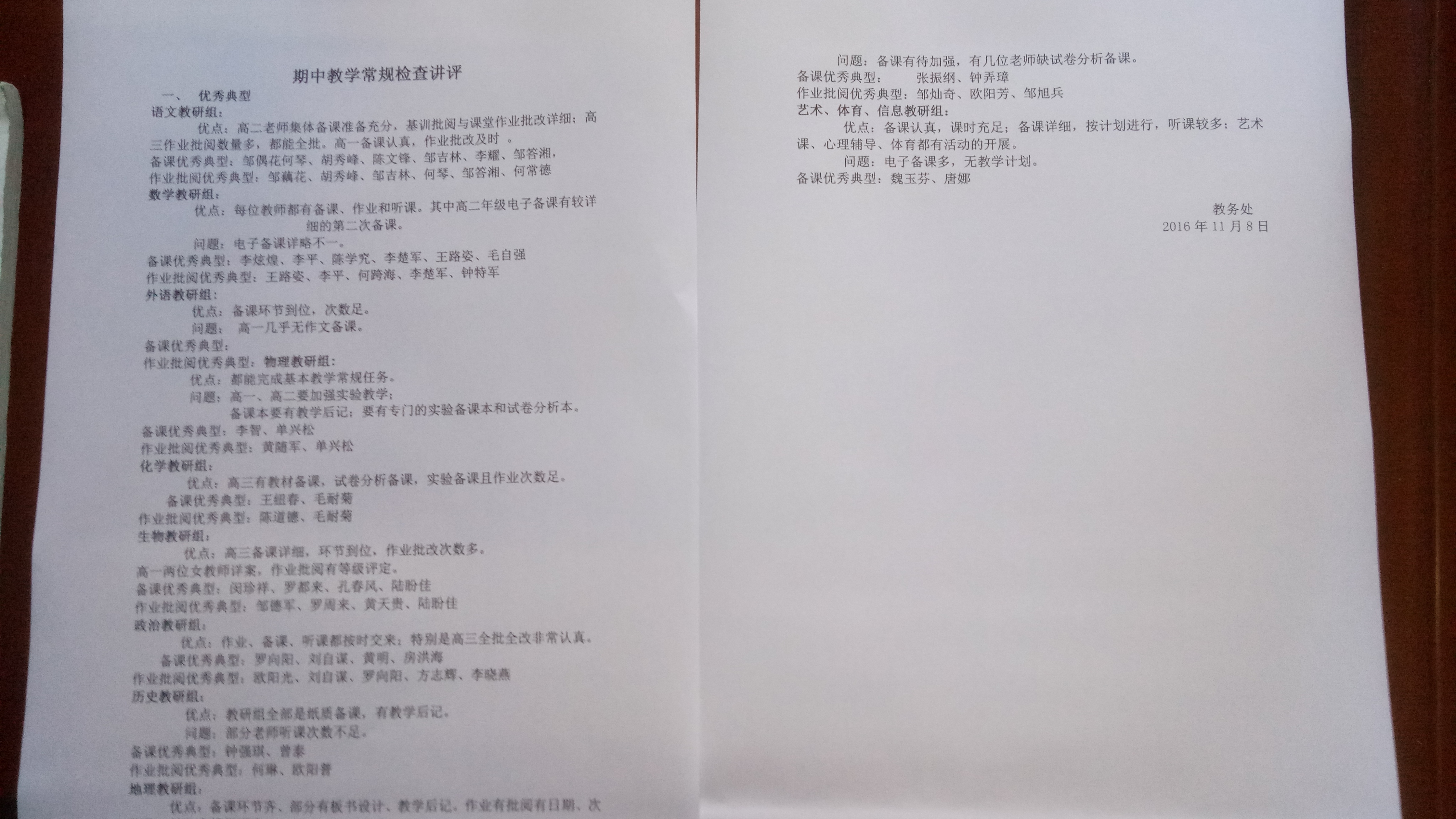 “各教研组要高度重视备课工作,提倡纸质稿为主,作业批改要及时到位,重视作业中的错题反馈;各教研组长要充分发挥核心作用,要建立微信群,及时掌握本组教学教研动态,关心和帮助青年教师成长。”11月8日,平江四中教务处、教科室成联合利用晚自习时段对全校所有科目的教学工作常规来了个突击检查,在随后召开的“教学工作期中专题讲评会”上,教务处主任张振刚就各组检查结果逐组作了讲评,校务成员和联组领导作了表态性发言。