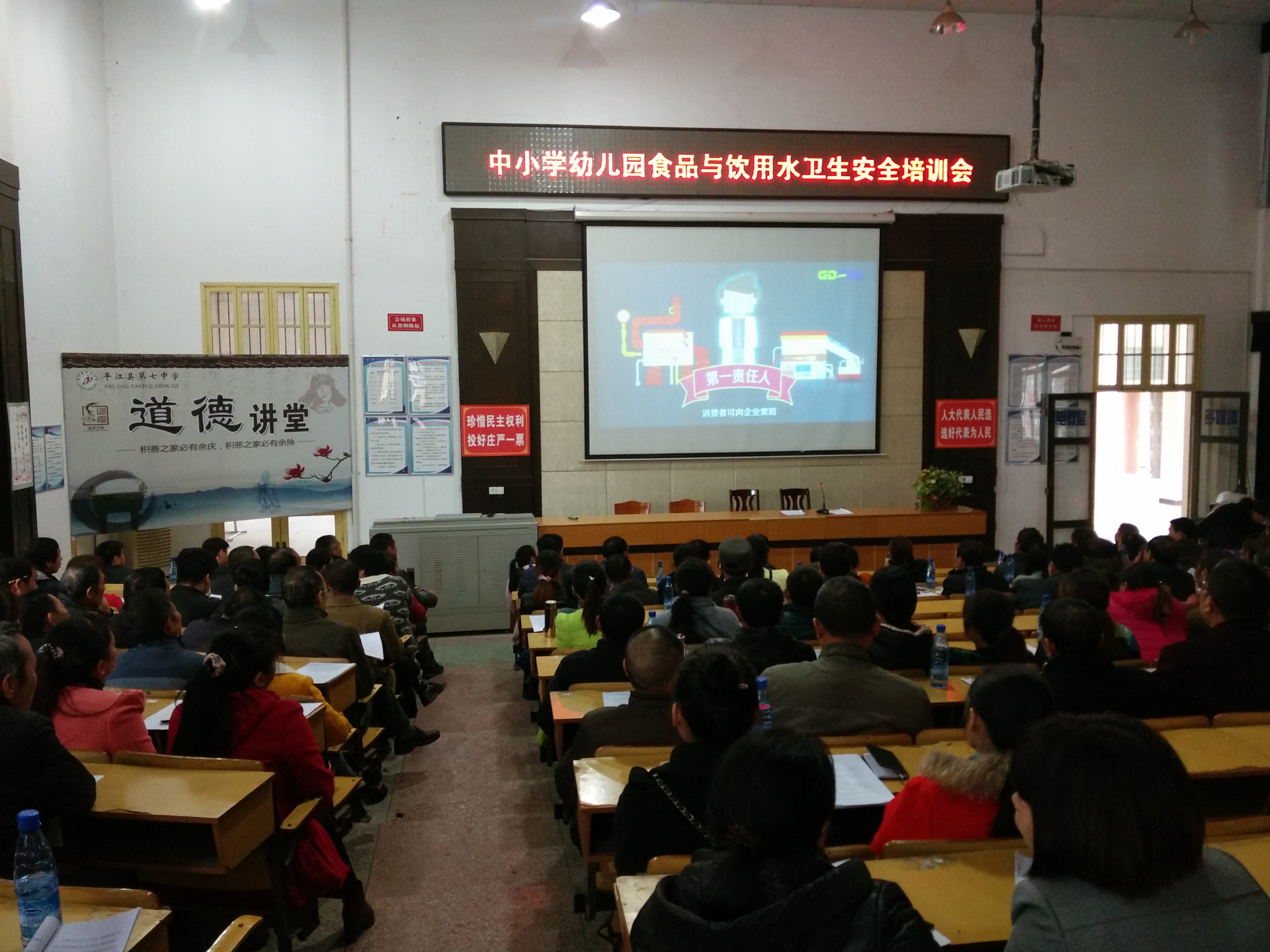 11月13日,200多名来自安定学区69所中小学幼儿园的食堂工友师傅们,冒着凄凄寒雨来到平江七中报告厅,参加食品与饮用水卫生安全培训。