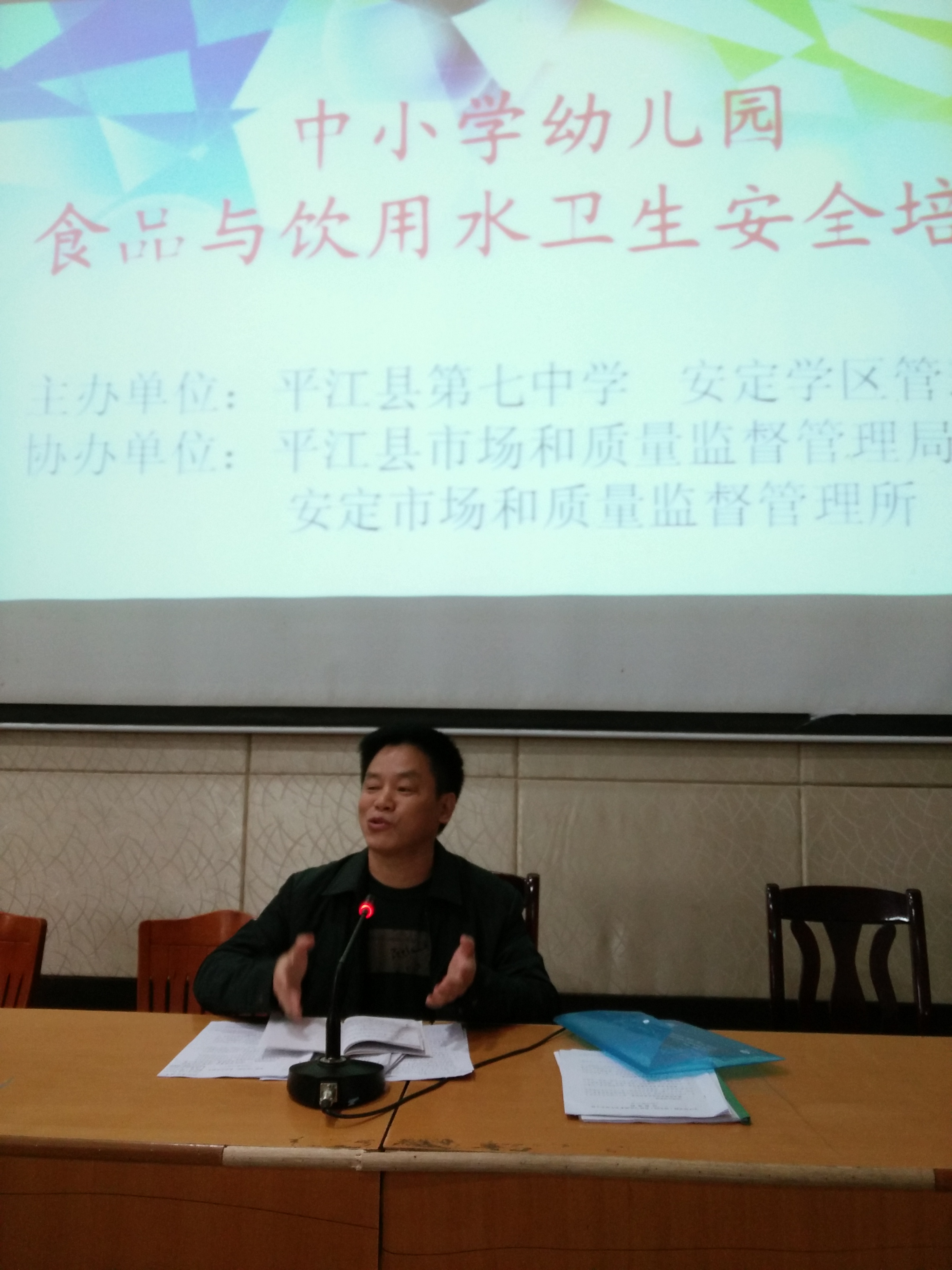 培训由安定学区管理办主办,县市场和质量监督管理局、安定市场和质量监督管理所协办。会上组织观看了《食品安全法》宣传视频,学习了《食品安全法》相关条款;县市场和质量监督管理局副局长刘士原作了食品与饮用水卫生安全专题讲座,刘士原先通报了一组食品安全事故案例,强调了食品安全的严峻形势,对食品采购、验收、贮存、粗加工、切配烹调、供餐、餐具清洗消毒、食品留样等各个环节的安全卫生要求作了详细具体的指导,对从业人员健康和个人卫生提出了明确要求,对后勤管理人员规范细致履行职责给予了针对性意见。学区勤管专干和安保专干结合实际对食品和饮用水卫生安全工作作了强调和部署。