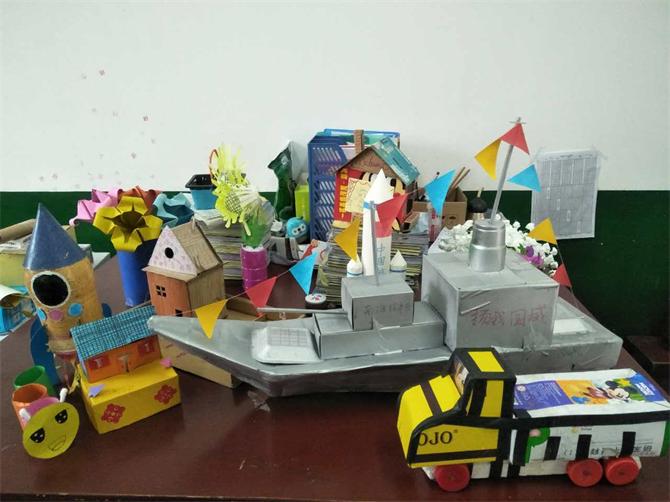活动中,同学们充分发挥想象力和创造力,用汽水瓶、饮料瓶和废弃材料,制作出船艇、小花瓶、火车、火箭、笔筒等工艺品。在制作的同时兴趣盎然,趣味无穷。各个班级自制的作品也是五花八门各有特色,有的特色新奇,有的以外观取胜。许多小制作都是废物利用,比如边角木板、纸盒、大饮料瓶、可乐罐、电池等材料制成的。这些制作别出心裁、用途不一、风格迥异。