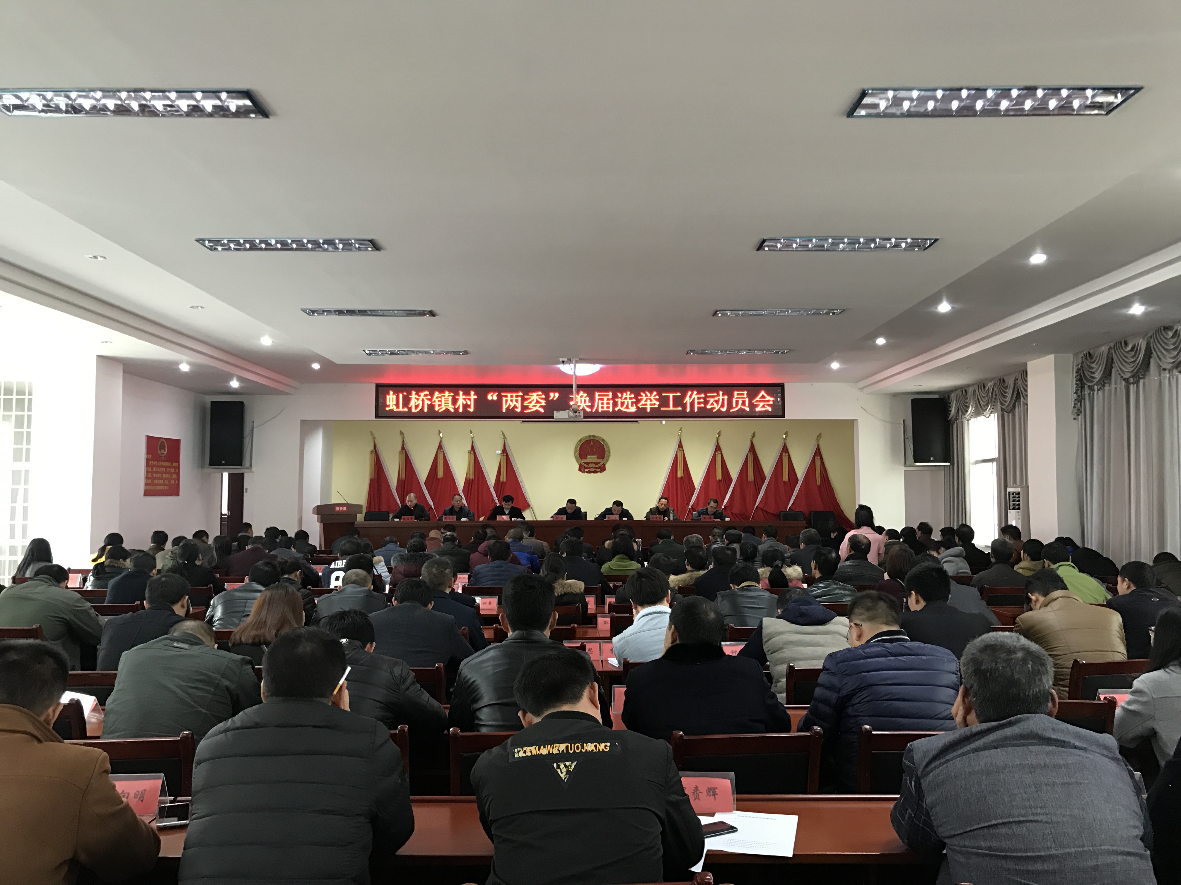 3月21日,虹桥镇村“两委”换届选举工作动员大会在镇机关大会议室召开。会议由镇党委副书记、镇长周李主持,各村(居)支部书记、主任、计生专干、镇直各部门负责人和全体机关干部参加会议。